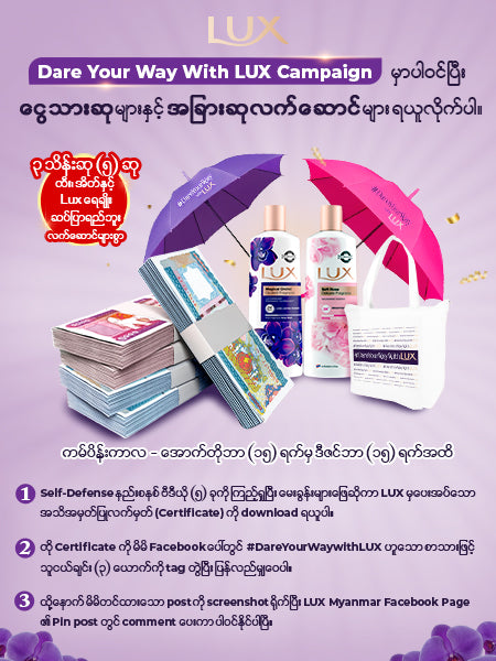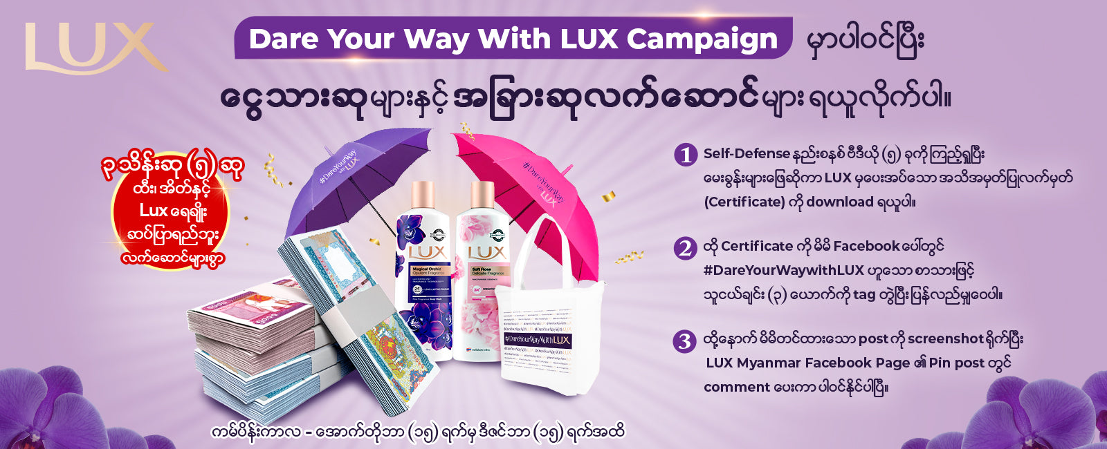 ဤကမ်ပိန်းသည် မြန်မာအမျိုးသမီးများ၏ အလှတရားနှင့် လုံခြုံမှုစွမ်းအားကို မြှင့်တင်ရန် ရည်ရွယ်ပါသည်။ အမျိုးသမီးများသည် နေ့စဥ်ရင်ဆိုင်ကြုံတွေ့နေရသည့် စိန်ခေါ်ချက်များ မည်သို့ပင်ရှိပါစေ မိမိတို့၏အလှတရားကို ခြွင်းချက်မရှိ ဖော်ပြရဲသည့် ယုံကြည်မှု တိုးပွားလာစေရန် ဤ Dare Your Way With LUX ကမ်ပိန်းကို ပြုလုပ်ကျင်းပရခြင်းဖြစ်ပါသည်။